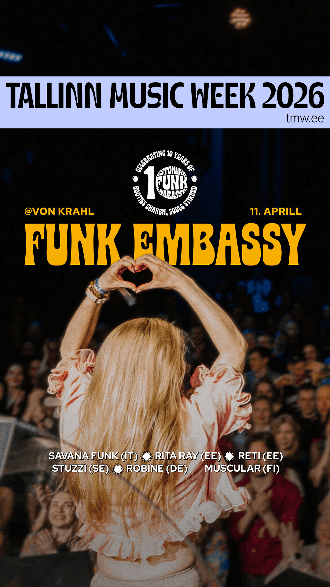 Tallinn Music Week on Funk Embassy jaoks alati olnud eriline puhk. Üks festivali armastatumaid muusikaõhtuid toob taas Von Krahli teatrimajja hulga värsket funk’i, soul’i, disco’t, R&B’d ja jazzi üle ilma ning muidugi ka valiku säravaid tegijaid meie enda õitsvalt skeenelt. On paras ime, et meie parasvöötmes elab ja hingab selline kogukond, nii et tule ja tähista funk’i saatkonna kümnendat tegevusaastat!