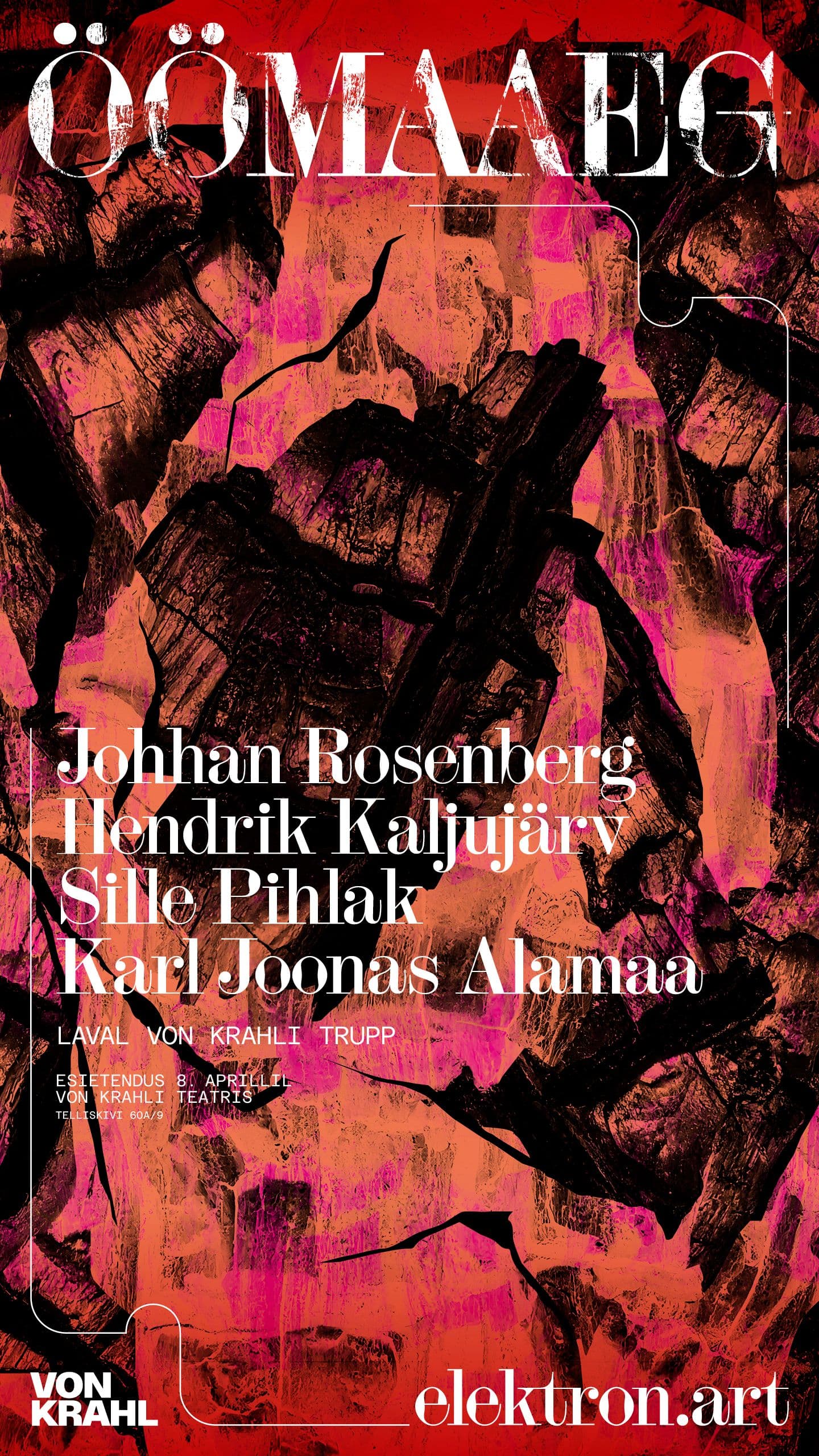 Von Krahl kutsub öisesse varjupaika02.04.2026Von Krahlis hakkab kõlama “Ooper”26.03.2026Pantheon rändab Šveitsi mainekale teatrifestivalile23.03.2026Osale Von Krahli Teatri publiku-uuringus ja võida auhindu!11.03.2026Noored ja märtsikuu Von Krahlis03.03.2026KRAHLI JOOGA02.03.2026Seeniorid ja märtsikuu Krahlis01.03.2026Von Krahli Teater ja Eesti teatri auhinnad27.02.2026Esietendub Mart Kangro uus soolo MEEDIUM19.02.2026Von Krahli laval elustub mälust kustutatud avangard: “Võit Päikese üle”28.01.2026Von Krahli Teater on muutmas oma nime14.01.2026Juhan Ulfsak pälvis kultuurikoostöö preemia02.12.2025Väärtusruum. Mäss. Tõkistuvi – Von Krahli Teatris esietendub ‘‘Tagasiside‘‘20.11.2025Vennad ja õed – Von Krahli Teater saab 33!31.10.2025Kultuuriorganisatsioonide ühispöördumine genotsiidi lõpetamiseks Gazas02.10.2025Von Krahli Teater ja elektron.art avalikustasid uue hooaja plaanid18.09.2025Elle Viies toob lavale iseloodud keele27.08.2025Von Krahl + elektron.art15.05.2025„Fundamentalist“ Helsinki Festivalil09.04.2025„Nälja“ magustoit30.03.2025Teatripäev27.03.2025Uus koduleht14.03.2025Teatriauhinnad28.02.2025Fundamentalist 10012.02.2025„No drama“ õlu30.10.2024